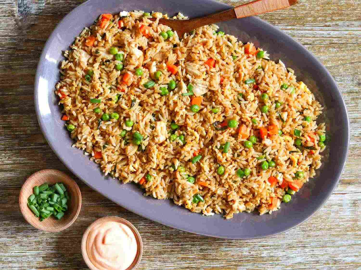 - Step 1:Heat canola and sesame oils in a large, nonstick skillet over medium-high heat. Add carrot and 1/4 cup green onion; cook, stirring constantly, for 1 minute. Stir in garlic powder and ginger and cook for 2 minutes. Stir in rice, salt, and pepper; cook, stirring only once or twice, until rice is lightly browned, about 4 to 5 minutes. Stir in chicken and peas; cook for 2 minutes.